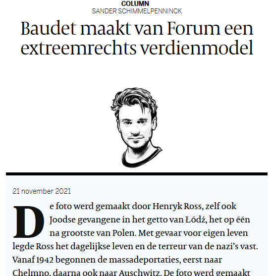 Waarom toch staat de krant het columnist Sander Schimmelpenninck toe om de meest gore speculaties over de motieven van FvD te brengen als feiten? Columnisten hebben uiteraard veel vrijheid. Maar geeft dat hen ook het recht om eigen ‘analyses’ – of beter: eigen onderbuik – te brengen als vaststaande feiten? Dacht het niet. Redactie, neem je verantwoordelijkheid en ga het gesprek hierover aan. En vertel Schimmelpenninck dan meteen om veel voorzichtiger om te gaan met woorden als fascisme.