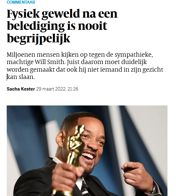 In het redactioneel commentaar van woensdag 30 maart 2022 neemt ook De Volkskrant stelling inzake Will Smith’s klap aan Chris Rock tijdens de Oscar-uitreiking. Op zich is dat standpunt, wat mij betreft, okay. Maar de krant meent mijns inziens ten onrechte dat Rock’s grap een ‘smakeloze’ was. Op de keper beschouwd was het juist een positieve grap, door Smith’s vrouw voor te stellen als de volgende G.I. Jane. Demi Moore speelde die rol eerder en was toen met haar stoere, kaalgeschoren kop een positief rolmodel. Bovendien lijkt het erop dat Rock geen weet had van de alopecia. Smith had dus geen terechte reden om zich beledigd te voelen. Hij ging uit van een verkeerde, kwaadwillende interpretatie. Zoiets zien we natuurlijk vaak. De aangevallene is dan terecht verbouwereerd over die negatieve uitleg, terwijl de aanvaller uit misplaatst medeleven ook nog eens getroost wordt. Voer voor psychologen.