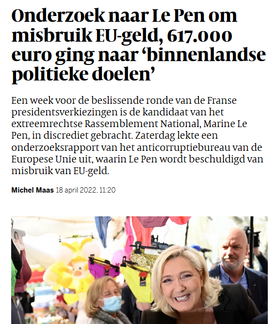 Het valt mij op dat de Volkskrant stug blijft vasthouden aan de kwalificatie ‘extreemrechts’ voor het Rassemblement National van Marine Le Pen (19 april, pag. 10). Gelieve daarmee per direct op te houden. Er was Marine veel aan gelegen de inderdaad extreemrechtse standpunten van haar vader uit het programma van de, zelfs hernoemde, partij te weren. Het zou meer dan fijn zijn als de Volkskrant dat als een positieve ontwikkeling onderkent en ophoudt met de reflex van de ‘extreemrechts’ beschuldiging.