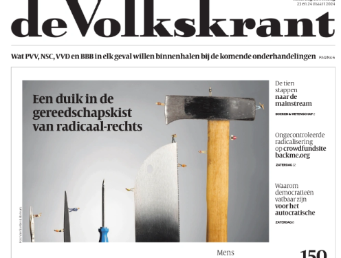 De krant heeft vandaag (23-3-2024) op de voorpagina een fotocollage van enkele gereedschappen, oplopend van een pincet tot maar liefst een hakbijl. Dat zou de gereedschapskist van radicaal-rechts zijn. Zéér suggestief allemaal. Of hakken de pennevruchten van ‘radicaal-rechts’ er bij de redactie echt op in?
