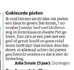 En zijn er nou voortaan dus zwarte én witte pieten? Die laatste dan met zwarte vegen? Dus dat er dan evengoed toch ook échte zwarte pieten zijn? Maar als dat zo is, dan is er toch geen echte doorbraak in het pietendebat bereikt? Want dan wordt er nog steeds met een negatieve stereotype gewerkt, toch?! Nou ja, negatief volgens Quinsy Gario dus.