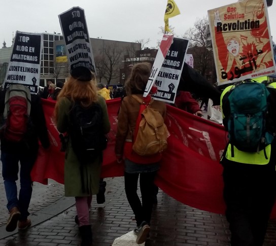 Goed, daar liep ik dan, temidden van mensen die voor meer dan 90 procent (schatting van mij) mijn mening over asielzoekers en Wilders verre van delen. Toch was dat voor mij geen belemmering. Ik ben van mening dat je bij een demonstratie naar het onderwerp moet kijken en dat alle personen en groeperingen die inzake dat onderwerp in essentie idem denken er present moeten of mogen zijn. Maar ook ben ik van mening dat al deze groeperingen hun overige meningen zolang thuis moeten laten en er dus niet bij de demonstratie mee te koop moeten lopen. Dus borden als hier – van ‘Internationale Socialisten’ (IS, Socialisme.nu) – zouden minstens officieel ontmoedigd moeten worden. Immers, door op eenzelfde poster je uit te spreken èn tegen klimaatverandering èn tegen oorlogschaos èn vòòr het welkom heten van vluchtelingen èn (op de andere zijde) de marlboro-poster te hebben waarop Wilders een extremist wordt genoemd, maak je het degenen die vluchtelingen asielzoekers niet welkom heten en/of wel op Wilders stemmen bijna onmogelijk nog ontspannen mee te lopen in het protest tegen de klimaatverandering.