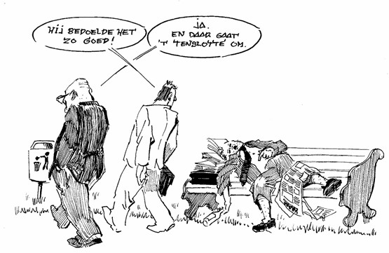 Wellicht is dit gedachtengoed ontstaan als antwoord op een rauwe, onbeschaafde, barbaarse samenleving. Het is ook een gedachtengang die we bij jonge kinderen maar beter wèl kunnen propageren. Maar in onze hedendaagse beschaafde samenleving pakt deze gedachtengang steeds meer en meer destructief uit. Dit wellicht ooit gezonde gedachtengoed is verworden tot vergif en we moeten er echt vanaf raken, althans voor wat de volwassenen betreft. Ik vrees dat we het daarbij niet moeten hebben van professoren zoals die recent dat rare pamflet ondertekenden. Ook heb ik er geen vertrouwen in dat de hedendaagse redacties bij de grote media de broodnodige bewustwording in gang kunnen zetten. Er zijn genoeg mensen die dat wèl zouden kunnen, ware het niet dat zij door de zittende heersers ver van de mediamacht worden gehouden. Al meer dan 10 jaar roepen deze mensen luid en duidelijk wat er mis is met al die goede bedoelingen. Steeds meer mensen horen hen en raken door hen overtuigd. Echter, het gaat te langzaam. Laat het niet zo zijn dat de inkeer te laat kwam om de teloorgang van onze westerse beschaving op tijd te stoppen.